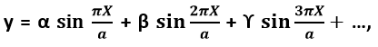 «… Итак, я говорю – это прямая речь Д. Бернулли, – что для решения вашей задачи: найти последующее движение по данной какой-либо начальной фигуре, следует определить количества α, β, ϒ,…, отождествляющие данную кривую с нашим неопределённым уравнением, и тотчас получатся частные изохронные колебания, из которых составится искомое движение». (Здесь следует дать справку из [1, с. 83]. Исходя из физических соображений (Замечание от Филиппова Л.И. – колебания струны), Д. Бернулли выдвинул чрезвычайно плодотворную, как стало ясно впоследствии, идею представить общее решение задачи о струне в виде суммы бесконечного ряда по синусам кратных дуг («принцип наложения колебаний»). При этом он опирался на убеждение, что при надлежащем выборе коэффициентов ряда можно удовлетворить любому начальному условию, т. е. что произвольная гладкая функция может быть представлена рядом по синусам. Это вызвало возражения Эйлера и Даламбера; указывалось, например, что сумма ряда синусов, будучи нечётной периодической функцией, не может изображать чётную функцию и т. д. В решении этого вопроса внёс достаточную ясность только Ж. Б. Фурье, в 1807 г. доказавший, что многие функции, «разрывные» по Эйлеру, т. е. представимые на отдельных частях отрезка различными аналитическими выражениями, представимы также на всём этом отрезке одним и тем же тригонометрическим рядом. Это открытие получило более широкую известность, когда вышла в свет «Аналитическая теория тепла», 1822) Фурье. После этого различение «непрерывных» и «разрывных» функций в смысле Эйлера потеряло значение. Вместе с тем возник кардинальной важности вопрос об условиях разложимости функций в тригонометрический ряд, исследование которого оказало огромное влияние на всё последующее развитие теории функций вплоть до наших дней (работы П. Лежен-Дирихле, Н. И. Лобачевского, Б. Римана, Г. Кантора, А. Лебега, Н. Н. Лузина, Д. Е. Меньшова и многих других учёных).).